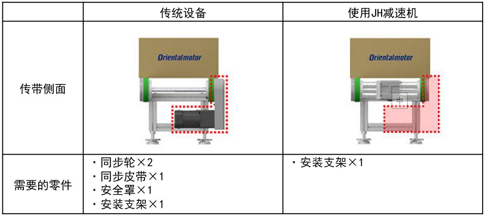削减零件数量的同时简化设计和减少安装成本。东方马达无刷电动机BMU系列/BLE2系列高强度直交轴中空轴型JH减速机对比传统设备: