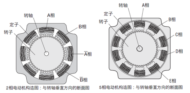 有A相至E相等5个相位的机型称为5相步进电动机、有A相和B相2个相位的机型称为2相步进电动机。