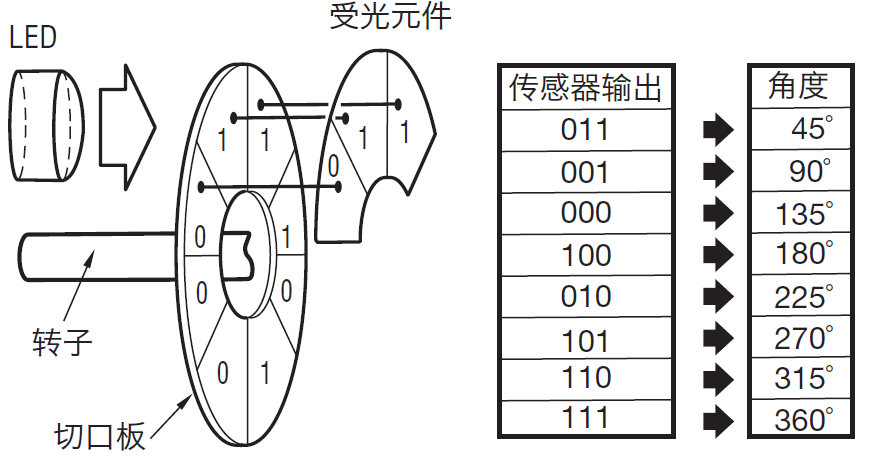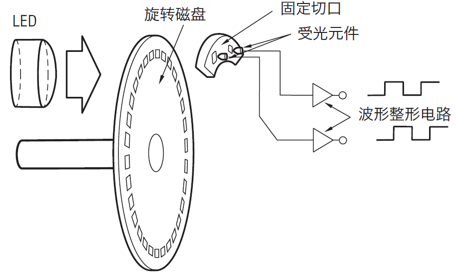 发光二极管(LED)发出的光线穿过切口圆盘上的位置检测模式,由受光元件读取。受光元件上集成有数十个光电晶体管。绝对位置检测用模式因编码器的旋转角度不同而全部不同。