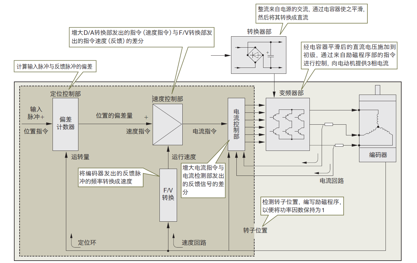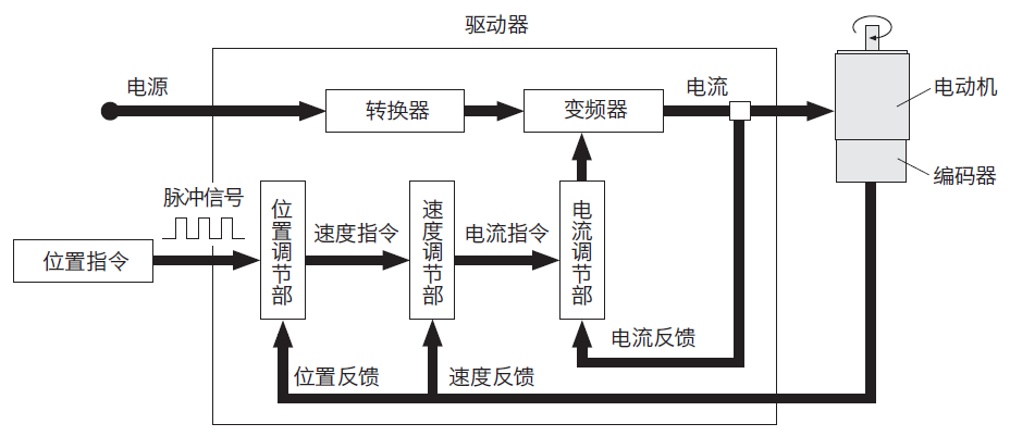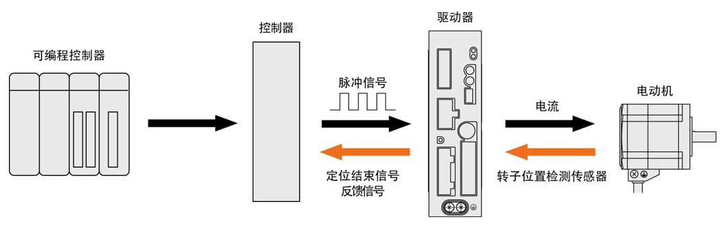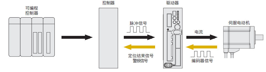 下图为脉冲型驱动器驱动伺服电动机时的系统构成示例。 电动机搭载旋转检测器(编码器),向驱动器反馈电动机轴的旋转位置/转速。驱动器通过演算从控制器发出的脉冲信号(位置指令/速度指令)与反馈信号(当前位置/速度)的误差,将此误差控制为0,进行电动机旋转的控制。是通过使用电动机、驱动器、编码器构成闭环控制,可以进行高精度定位运行的电动机。