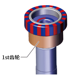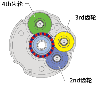 中心的电动机轴上设有1个齿轮(1st齿轮),与该齿轮相连的有2列齿轮。 第1列齿轮由二级齿轮构成(1st/2nd 齿轮、2nd/3rd齿轮),第2列齿轮由一级齿轮构成(1st/4th齿轮)。