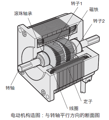 步进电动机构造上大致分为定子与转子两部分。转子由转子1、转子2、永磁磁钢3部分构成。
