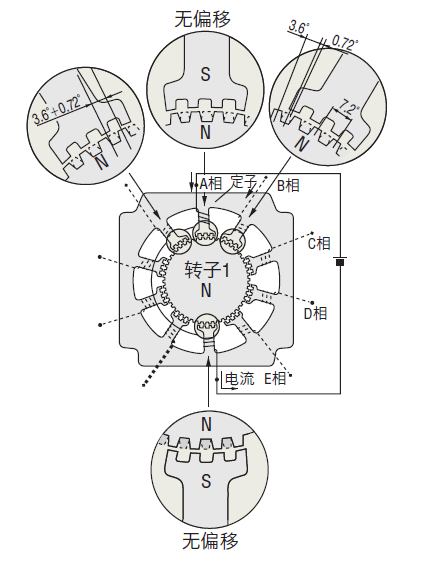将A相励磁,会使得磁极磁化成S极,而其将与带有N极极性的转子1的小齿互相吸引,并与带有S极极性的转子2的小齿相斥,于平衡后停止。此时,没有励磁的B相磁极的小齿和带有S极极性的转子2的小齿互相偏离0.72°。以上是A相励磁时的定子和转子小齿的位置关系。