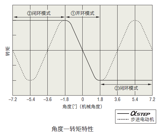 通常情况下,驱动步进电动机需要驱动器、控制器以及上位可编程控制器。由于αSTEP在电动机的反输出轴侧内藏编码器,因此通过编码器信息反馈给驱动器,从转子旋转位置判断过负载领域。在过载领域时,切换到闭环控制,根据转子的旋转位置,将定子的旋转磁场控制在最佳位置。