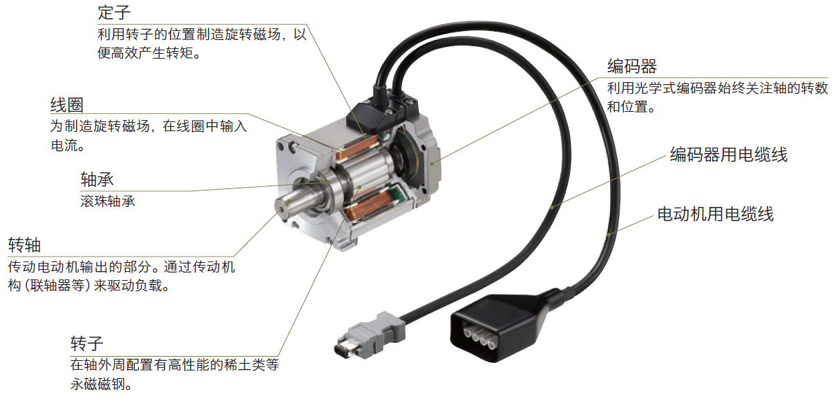 电动机搭载编码器,用于向驱动器反馈电动机轴的旋转位置及转速。