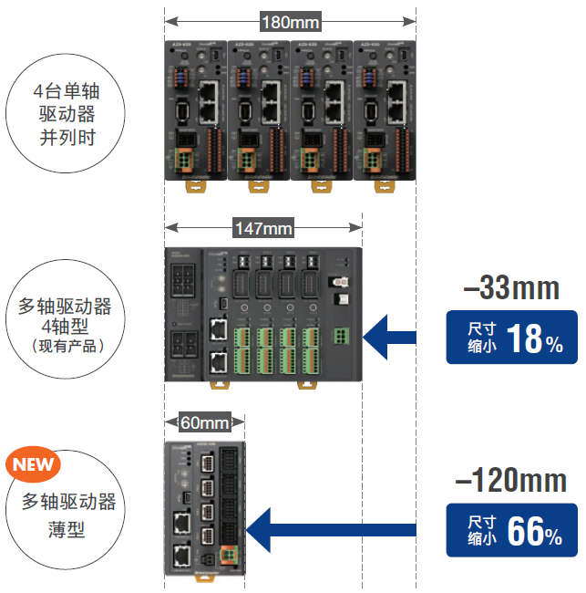 与传统驱动器相比,多轴驱动器·薄型可减少约66%的安装空间。