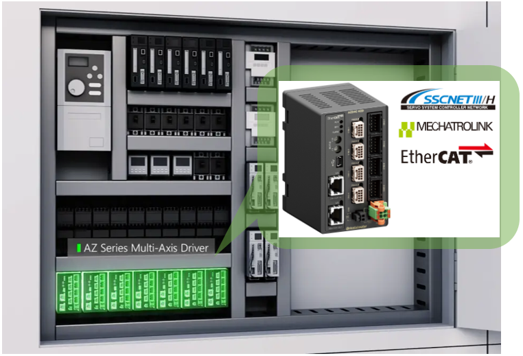 AZ系列多轴驱动器·薄型拥有对应EtherCAT、MECHATROLINK-Ⅲ、SSCNETⅢ/H的产品阵容。通过一个驱动器控制多个轴,减少控制柜中的配线布置,减少繁杂的布线工序,提升研发效率