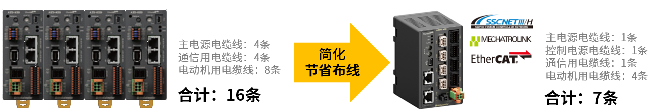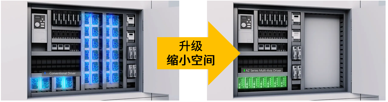 痛点: 因工艺流程升级、增加等,在相同设备空间中新增工位轴数,但控制柜空间难以容纳新增的驱动器与布线设置。