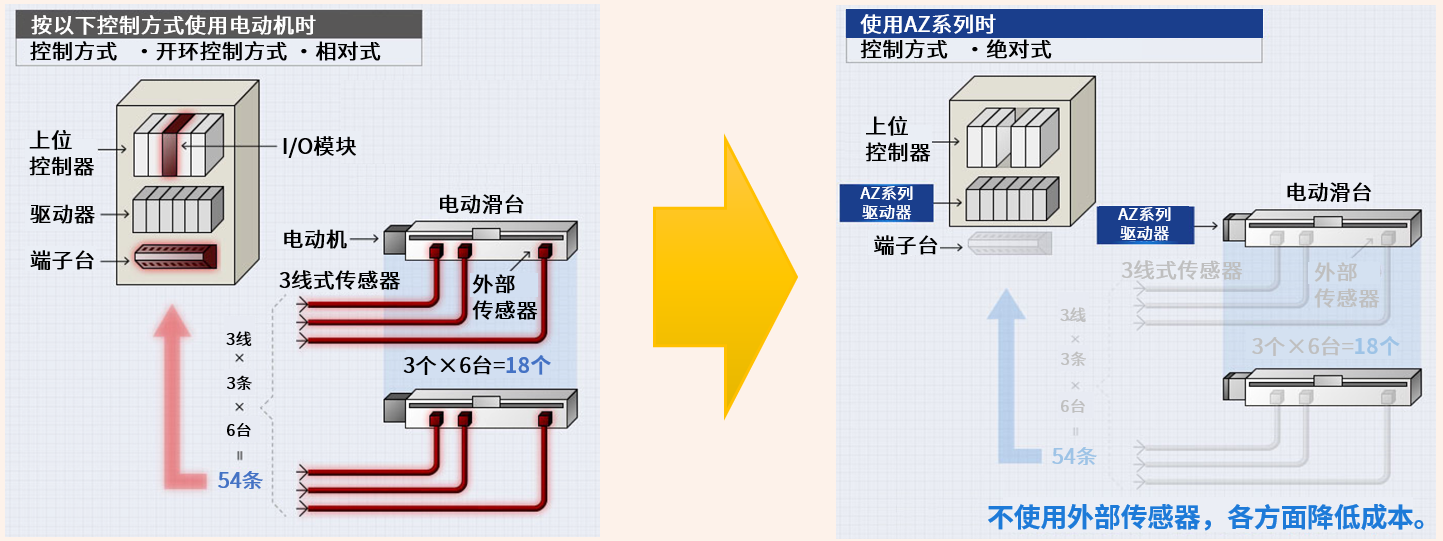 此外,AZ系列步进伺服混合控制系统步进电动机搭载机械绝对式ABZO编码器,机构上可免传感器,同时可节省控制柜上I/O模块、端子台等元件设置,进一步提升空间利用率