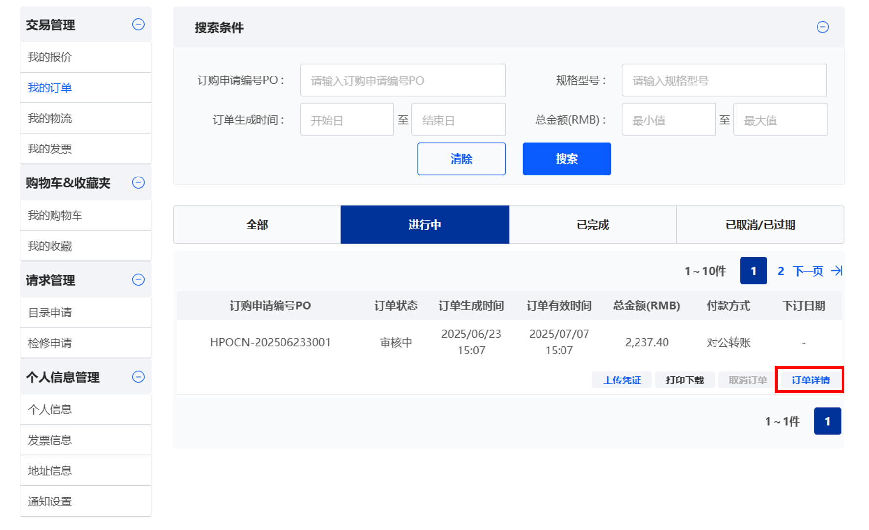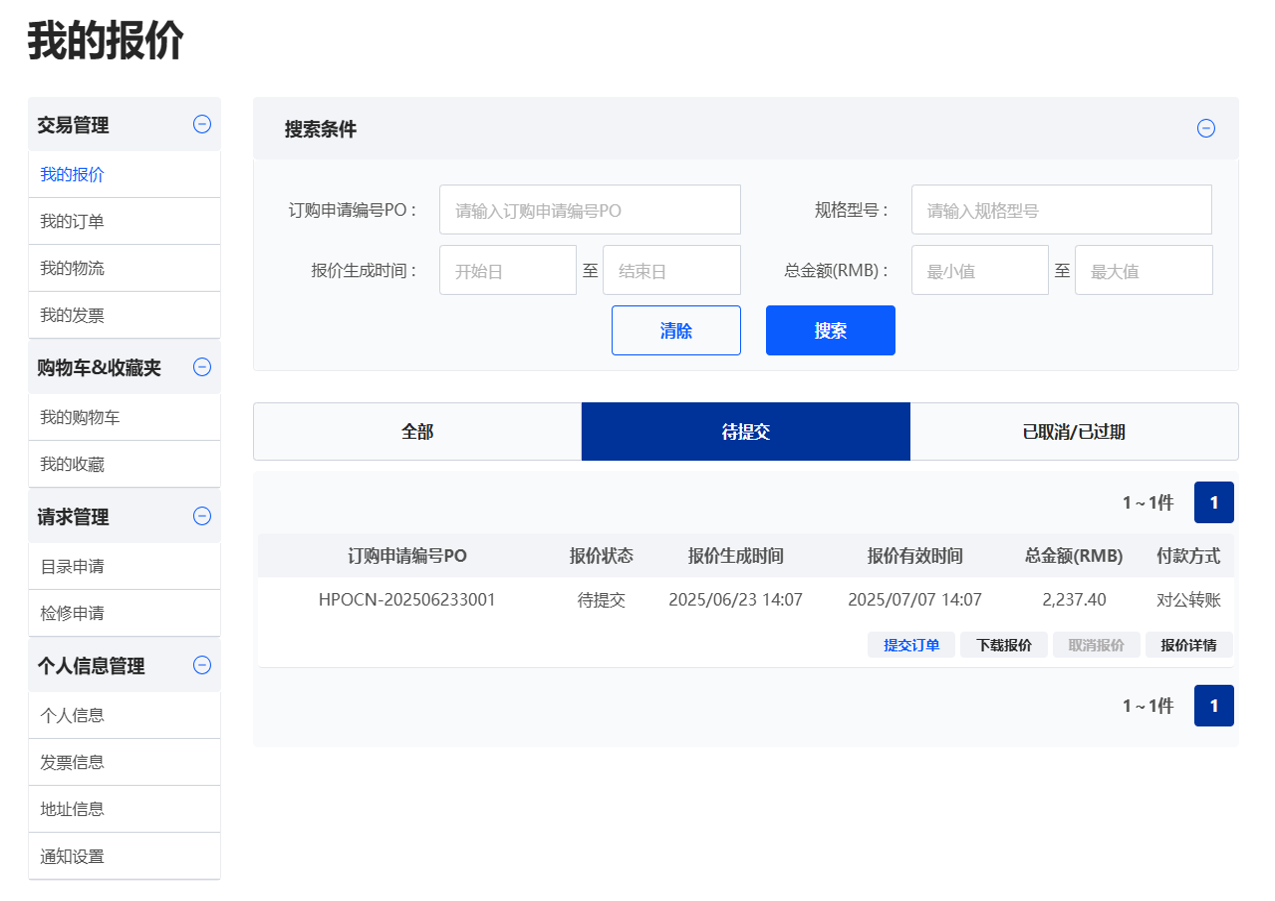 找到待提交订购的报价后,点击“提交订单”按钮。