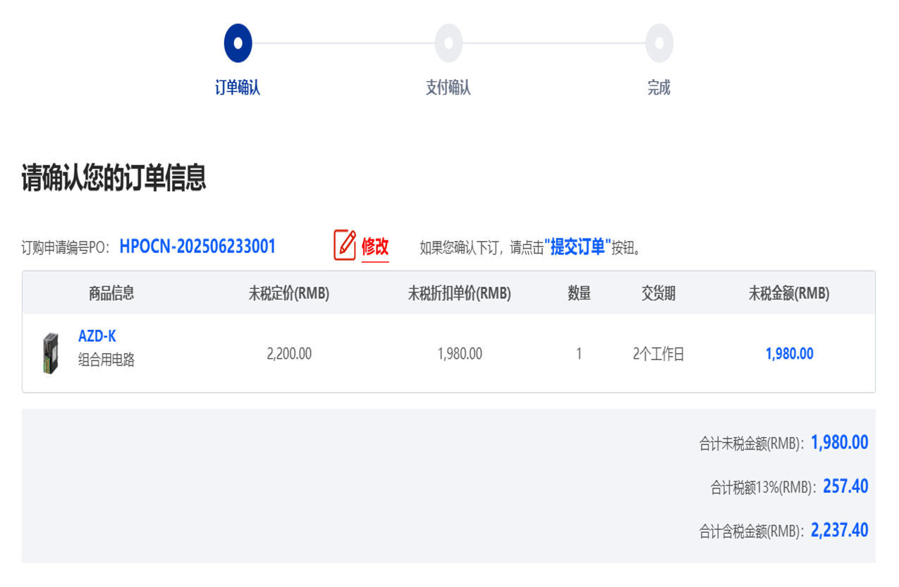 如需修改订购申请编号PO,请点击“修改”按钮。