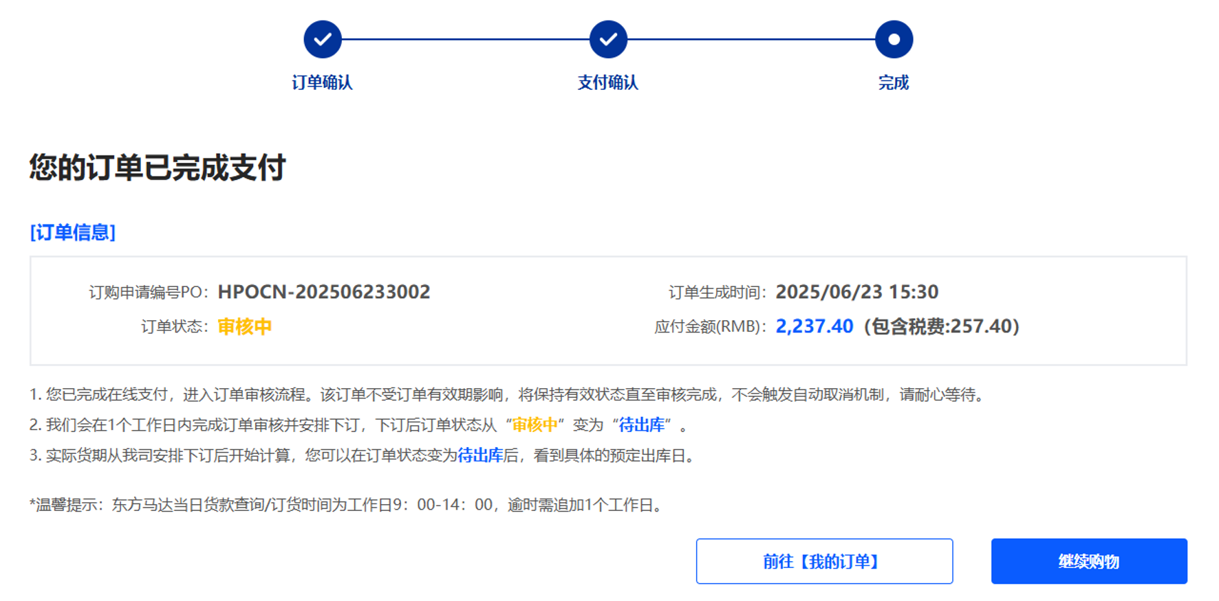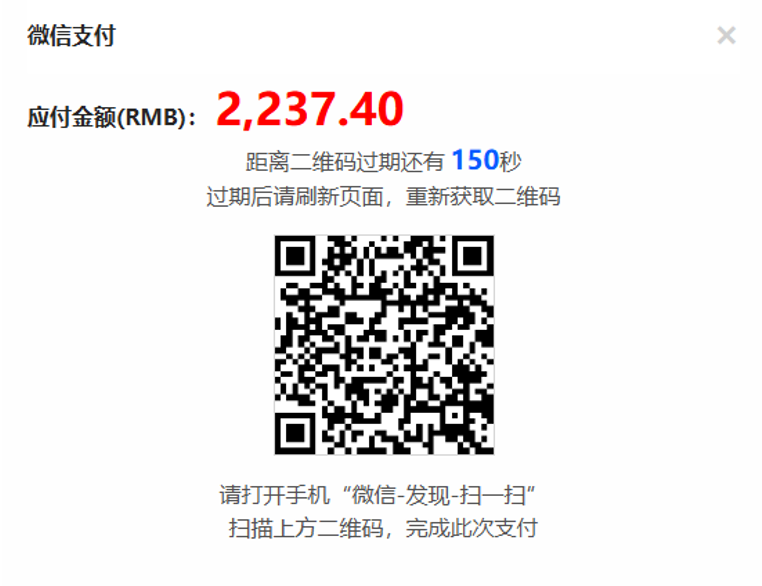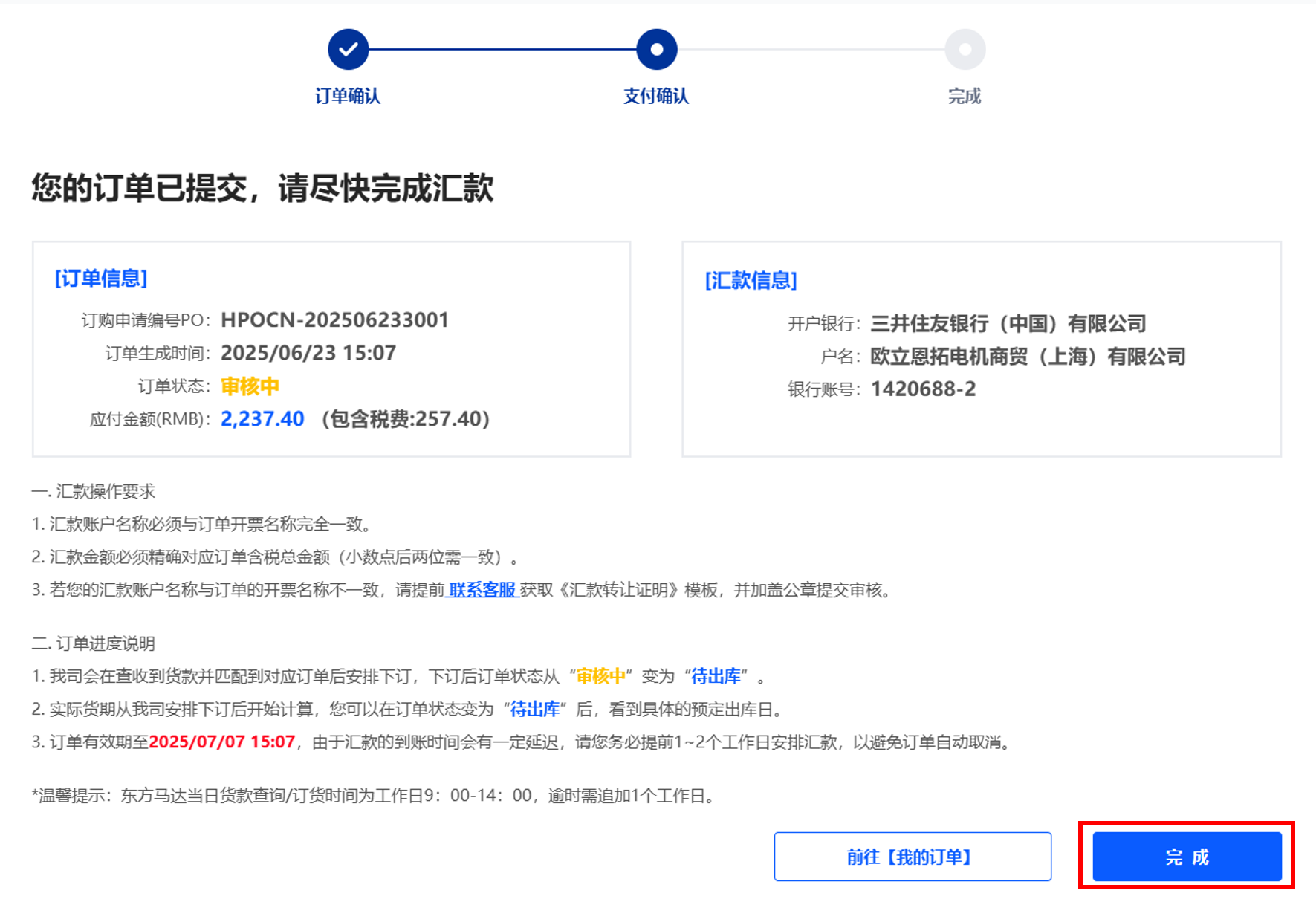 ① 如果您选择的付款方式为对公转账,请点击“完成”按钮并进行转账汇款。
