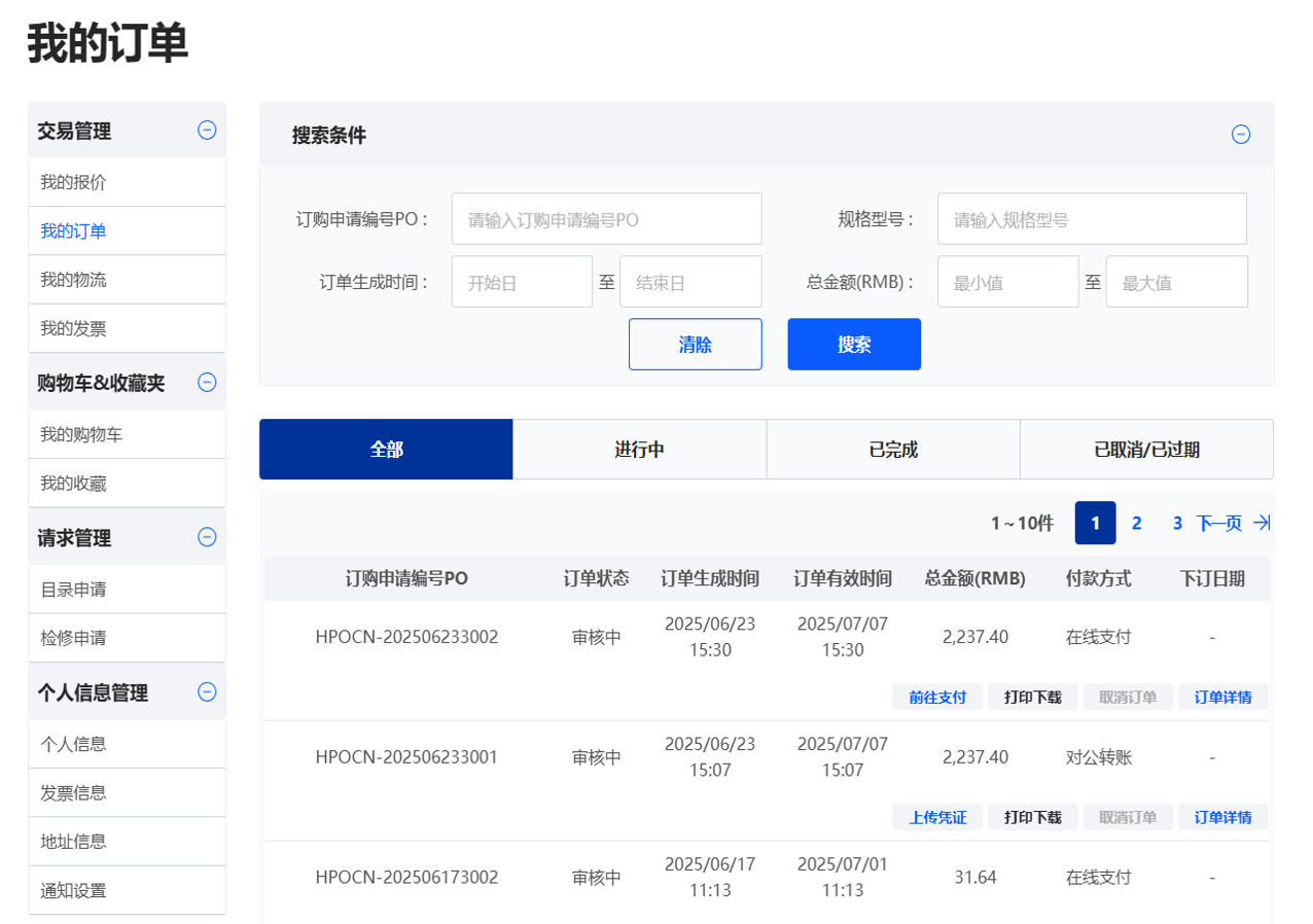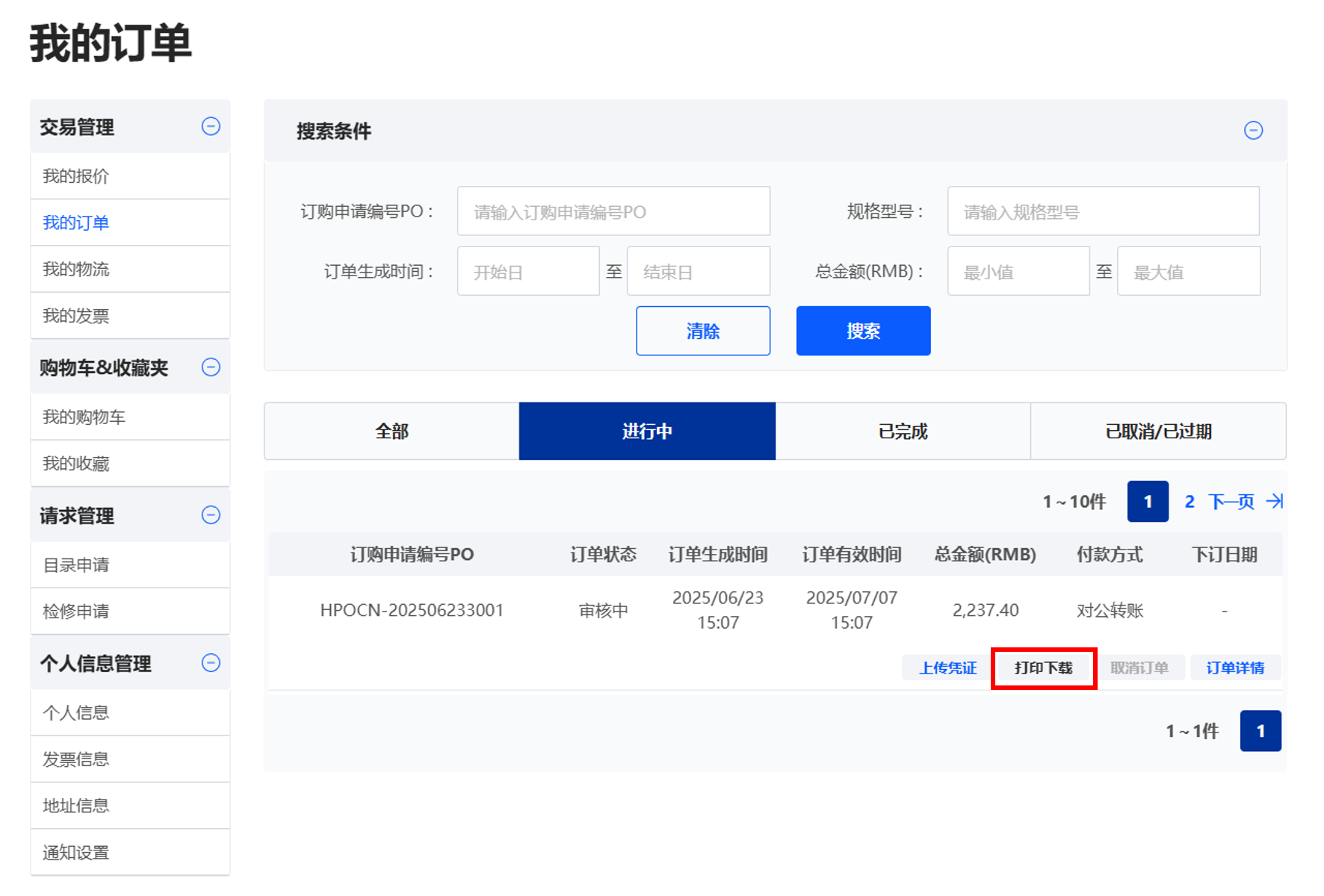 如需打印、下载订单,请前往“个人中心-我的订单” ,点击对应订单下的“打印下载”按钮,完成下载。