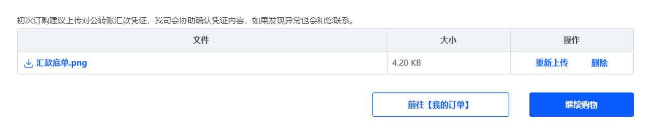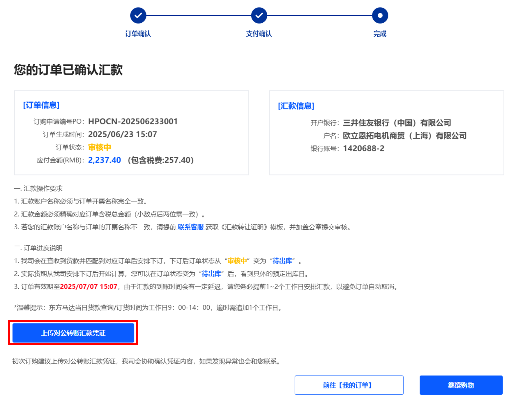 完成汇款后,可以点击“上传对公转账汇款凭证”按钮。