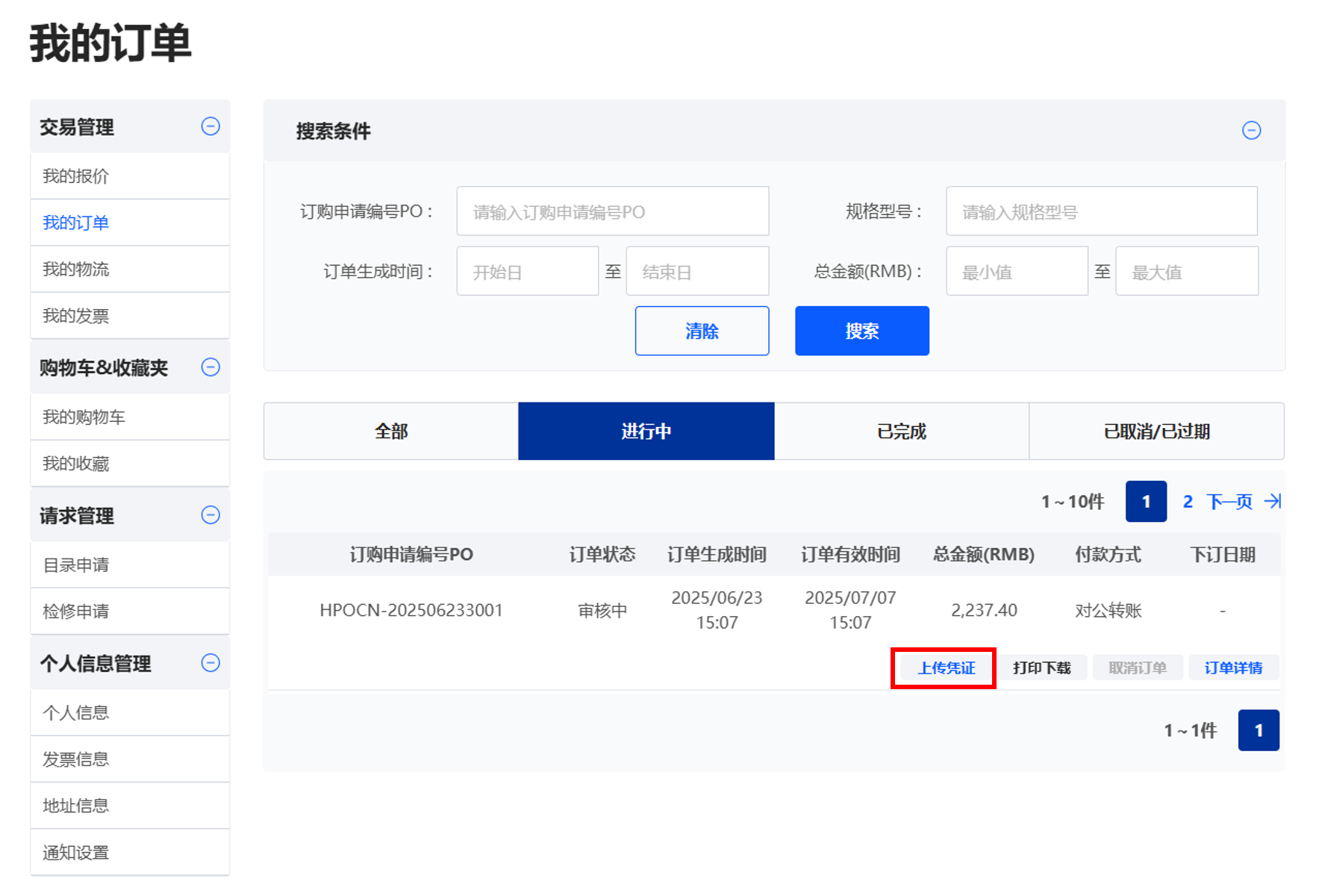 ② 前往“个人中心-我的订单”,找到对应的订单,点击“前往完成”或“上传凭证”按钮,也可以进行汇款确认或凭证上传。
