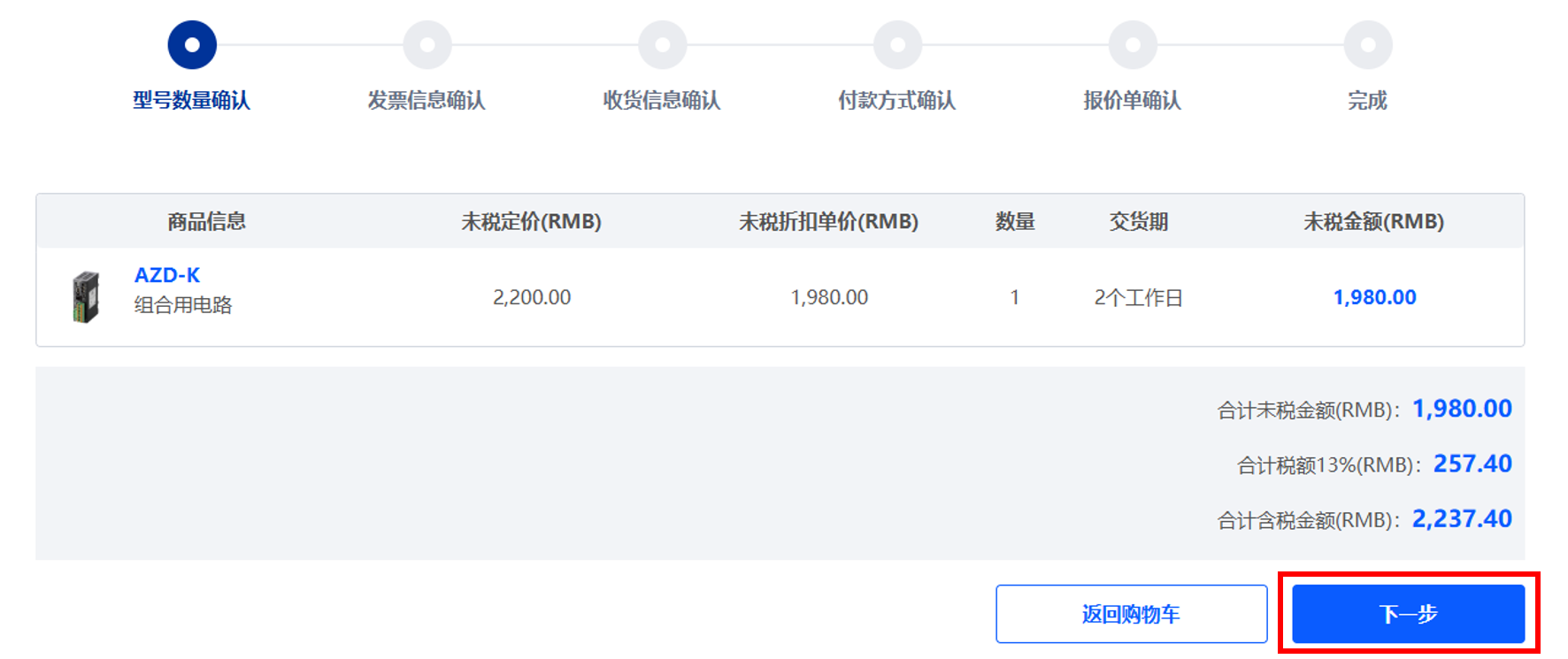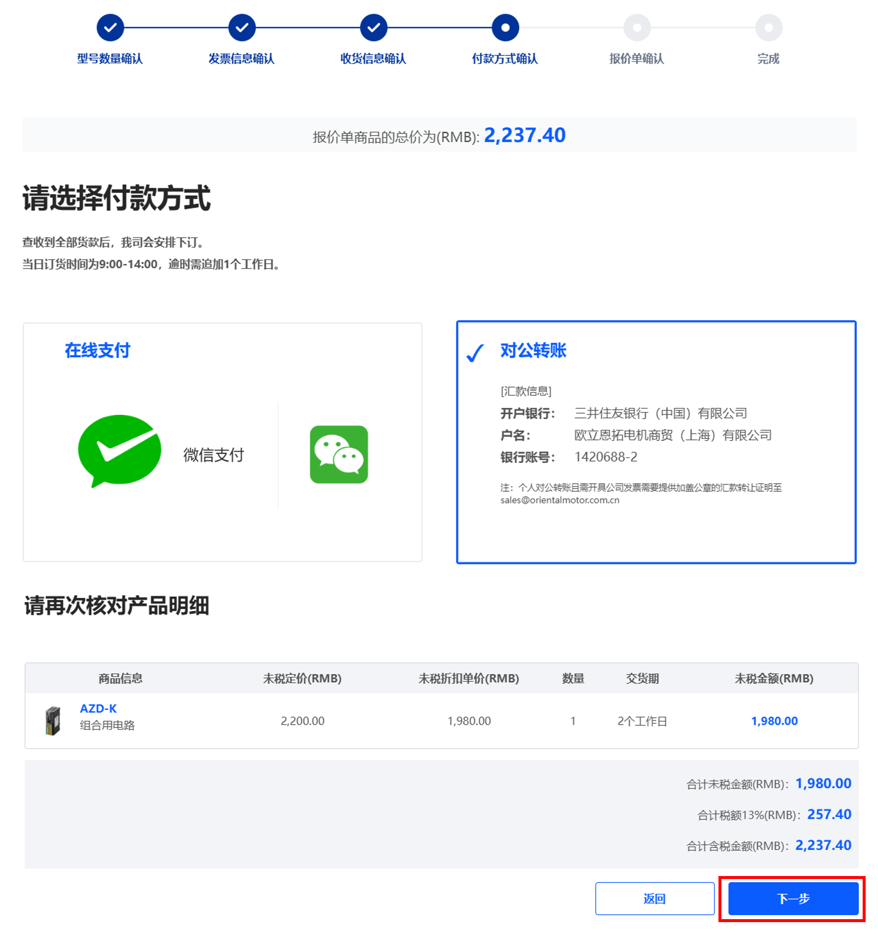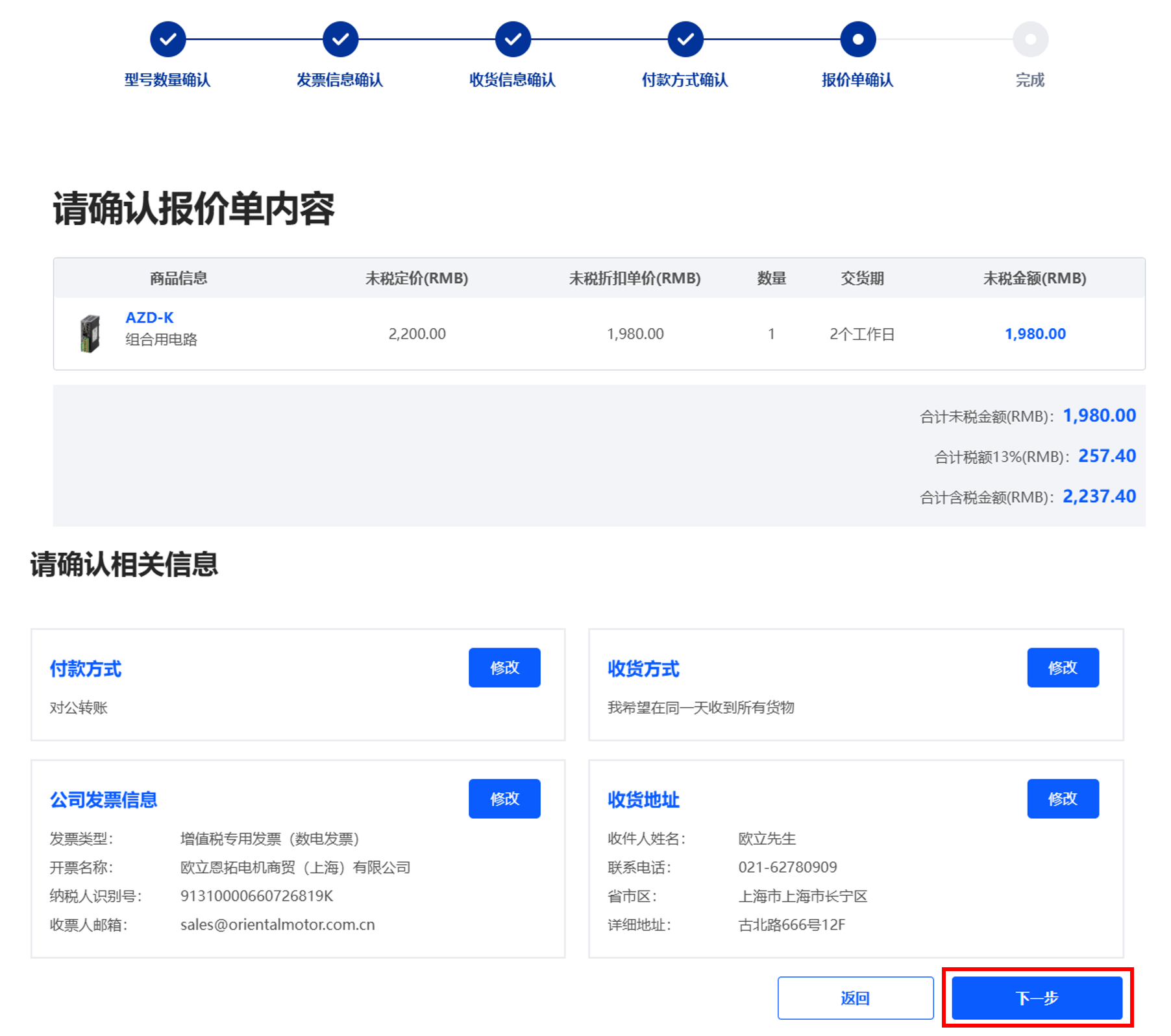 确认报价单全部信息无误后,点击“下一步”按钮。