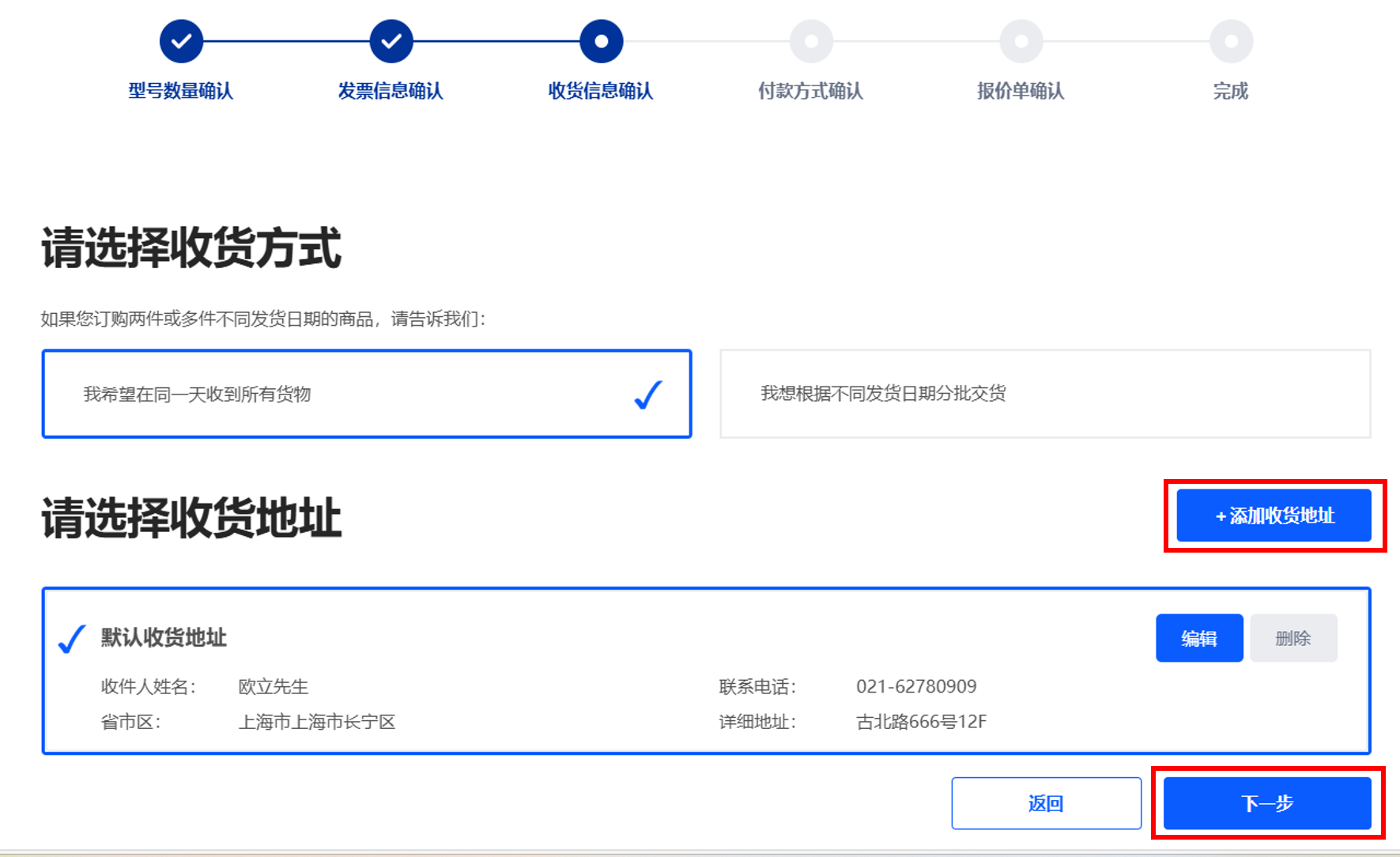 从下方列表中选择收货方式和收货地址后,点击“下一步”按钮。