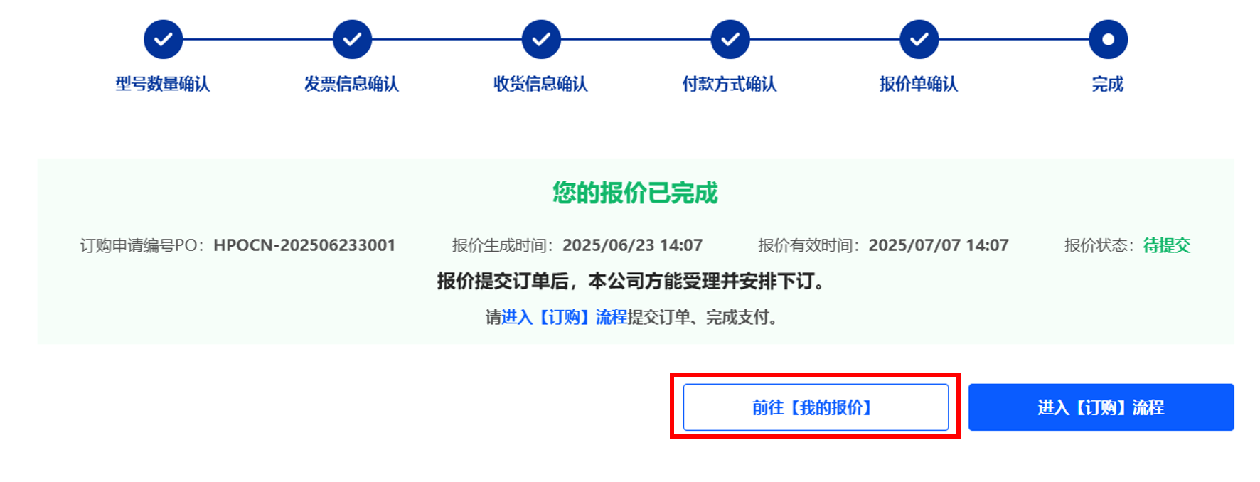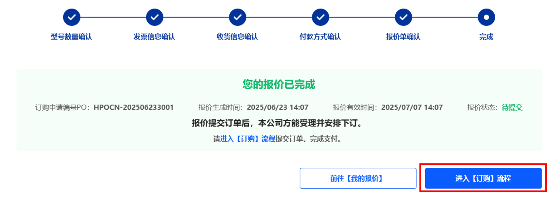您的报价已完成,有效期14天。如需订购,请点击“进入【订购】流程”按钮。 订购相关问题,请点击这里查看使用指南-订购流程。