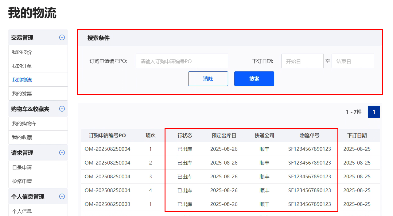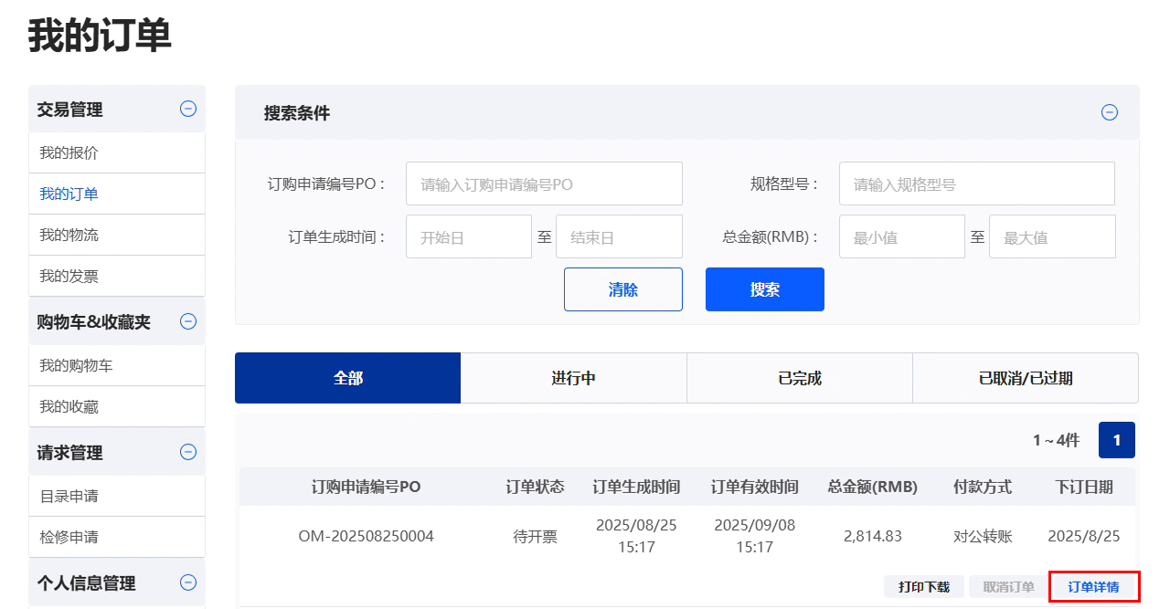 您可以通过“订购申请编号PO”模糊搜索目标订单明细行,也可以通过“下订日期”筛选某段时间的所有订单明细行。