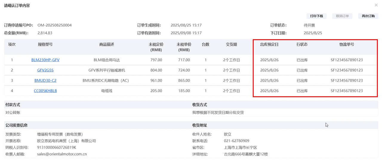 ③ 进入订单详情,您可以查看最新的“预定出库日”、“行状态”和“物流单号”。