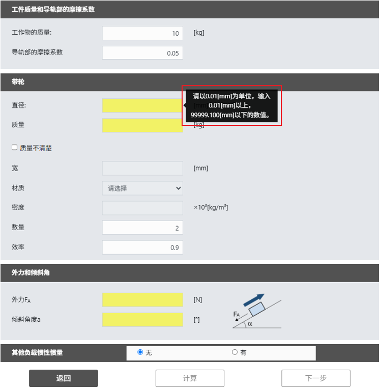 输入机构参数和运行条件,并选择电动机种类等参数后,即可在网站上进行选型计算。