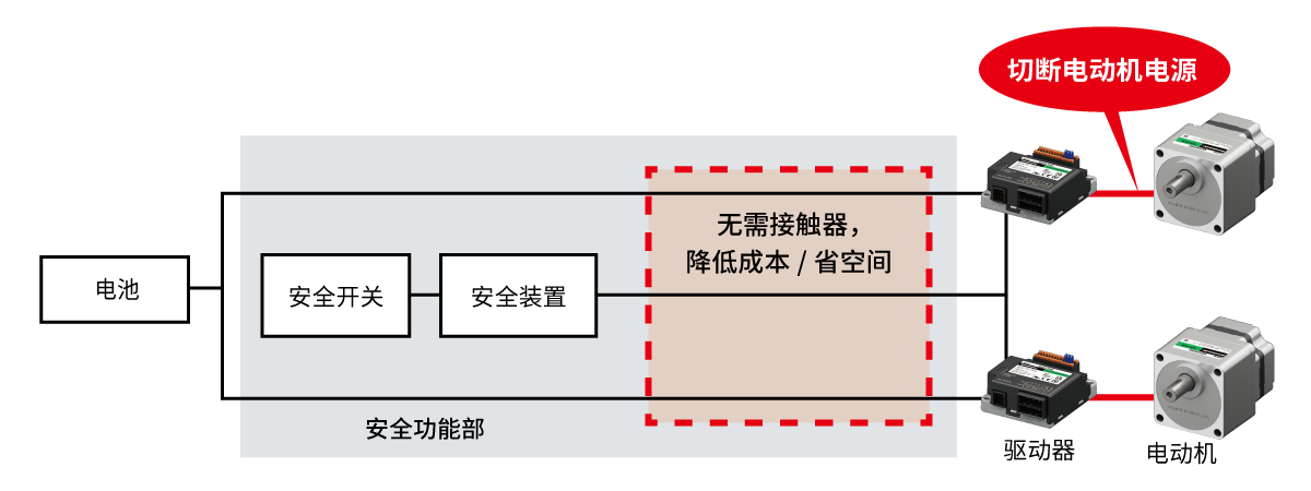 驱动器搭载STO,无需额外配置防止意外的接触器,有效降低设备成本并节省安装空间。