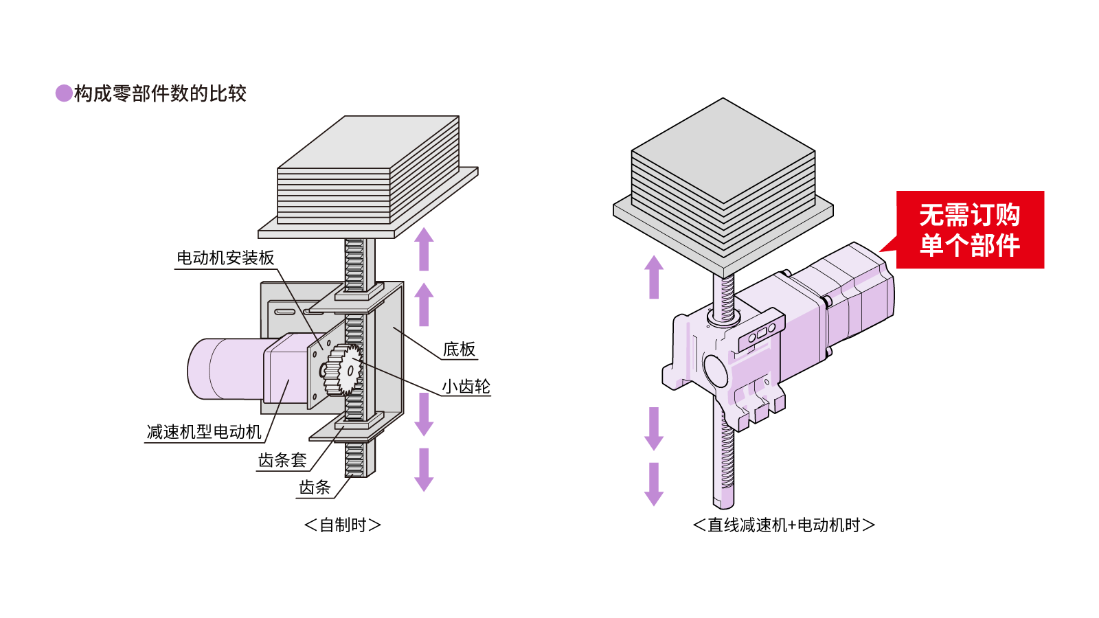 采用本公司齿条・齿轮机构,可以减少使用的零件数量,减少设计和组装耗费的工时。