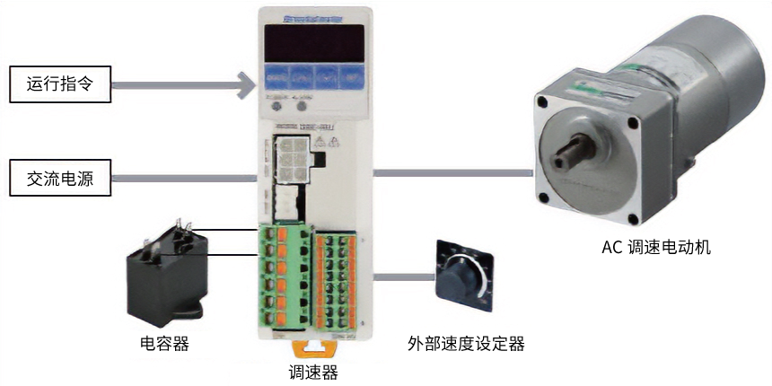 AC调速电动机是一种在感应电动机及可逆电动机上组装了速度检测用比率发电机(交流发电机)的电动机。与专用控制电路(调速器)组合使用,可调整速度。