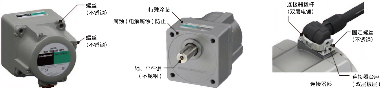 表面施加特殊涂装,不易生锈,输出轴与螺丝使用不锈钢材质。 安装面也经过涂装,因此安装在不锈钢设备上也不易生锈。