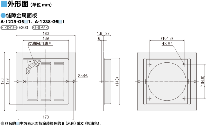 | 说明 | 可安装1台轴流风扇。 面板(1片 颜色:奶油色)、铁制防护网(1片)、风扇安装用螺丝、面板安装用螺丝的套件品。 |