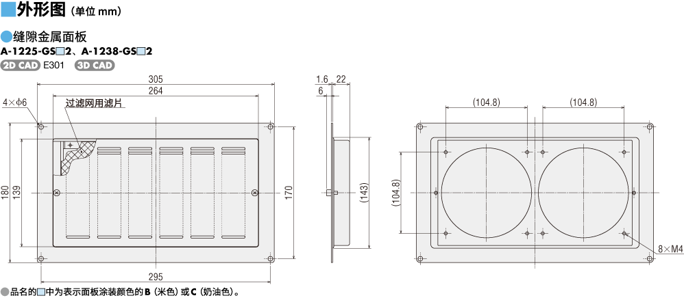 | 说明 | 可安装2台轴流风扇。 面板(1片 颜色:奶油色)、铁制防护网(2片)、风扇安装用螺丝、面板安装用螺丝的套件品。 |