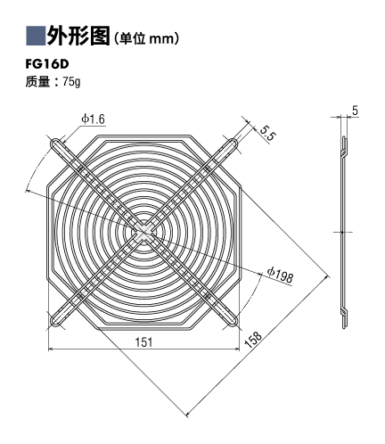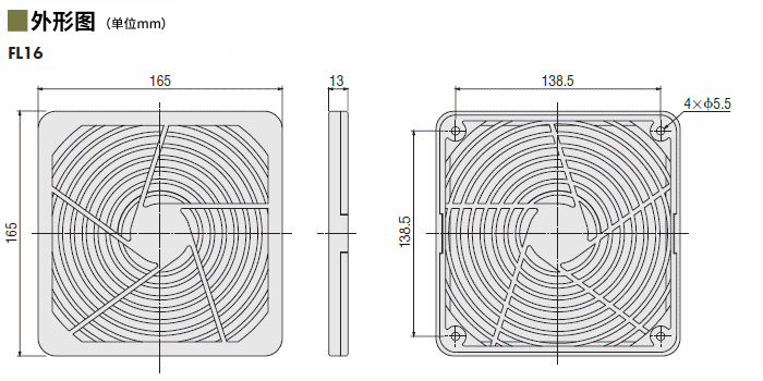 | 说明 | 防护网(1片)、滤网(1片)及安装螺丝的套件品。 (适用轴流风扇的尺寸: □160 mm) |