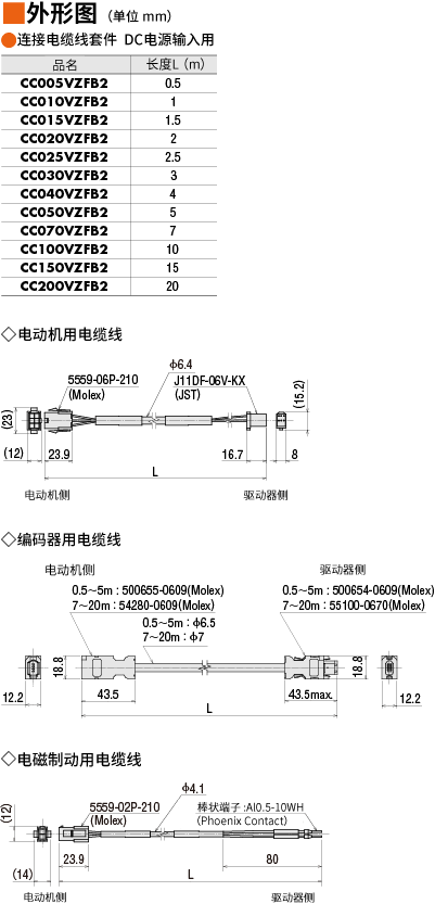 | 说明 | 电动机与驱动器间连接时必需的电动机用电缆线、电磁制动用电缆线套件。长度0.5 m |