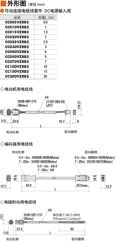 | 说明 | 电动机与驱动器间的可动电动机用电缆线、可动电磁制动用电缆线套件。请于电动机安装在可动部,电缆线需弯曲时使用。长度2 m |
