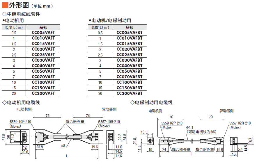 | 说明 | 电动机与电缆线间中继时必需的电动机用电缆线、电磁制动用电缆线套件。长度3 m |