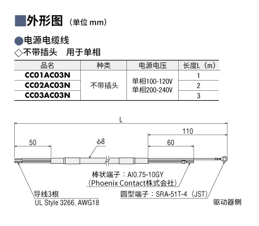 说明 单相100-120 V/200-240 V用 长度3 m