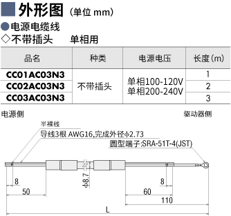 说明 用于连接AR系列AC电源输入型用驱动器(单相)与电源的电缆线。 长度3 m