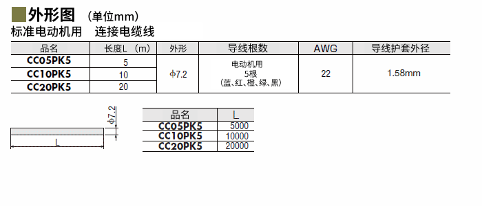 说明 电动机与驱动器间的延长用连接电缆线。无端末处理、5芯(蓝、红、橙、绿、黒)、长10 m