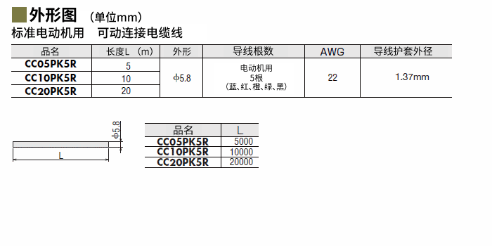 | 说明 | 电动机与驱动器间的延长用连接电缆线。无端末处理、5芯(蓝、红、橙、绿、黒)、长10 m |