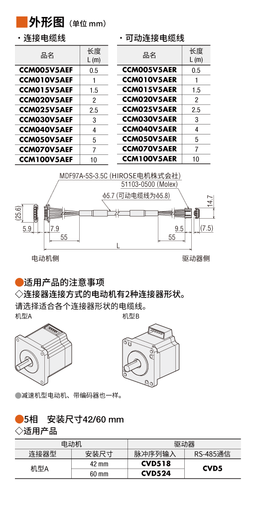 | 说明 | 连接器连接方式电动机与驱动器直接连接用的可动电缆线。请于电动机安装在可动部,电缆线需弯曲时使用。两端带连接器,长10 m |