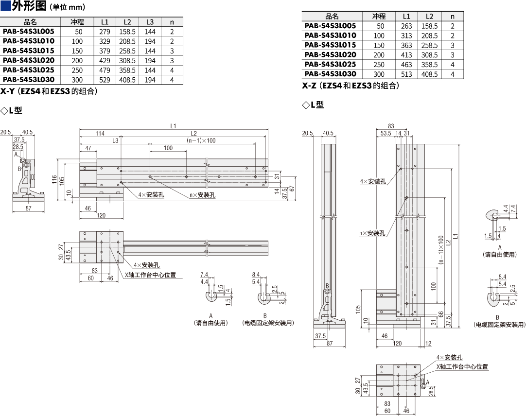 | 说明 | EZS4与EZS3的组合 L型 2轴侧行程250 mm |