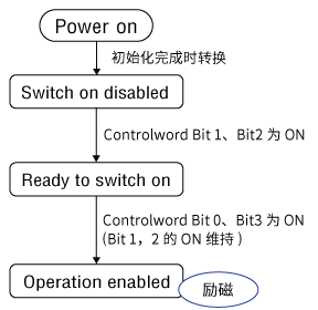要励磁电动机,需要更改Controlword对象(6040h)的值,并将驱动状态机转换到“Operation enabled”状态。请按以下方式更改Controlword。