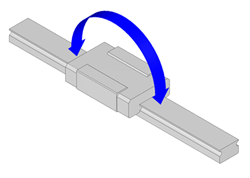 这次是将电动滑台朝右移动时的例子,其形态是透过加速度,对工作物施加与前进方向相反方向的力道,因此将对直线导轨施加垂直方向的负载惯性力矩。 除此之外,朝上下方向设置电动滑台时,也会因重力加速度而施加负载惯性力矩,因此也必须注意安装条件。