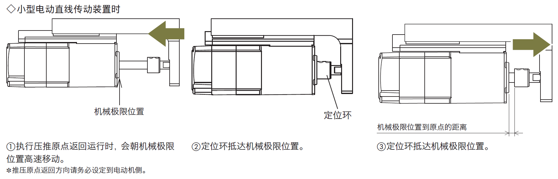 压推原点返回运行是一种以机械界限位置和定位环压推位置为基准的原点返回方法。 定位环仅在向电动机侧移动时使用。
