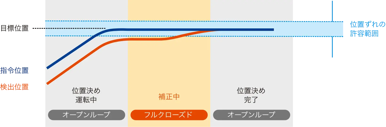 驱动器预先设定定位的容许范围(就位范围)。在操作停止后,如果机械端的检测位置超出容许范围,则自动进行校正操作,校正外部编码器获得的检测位置与指令位置之间的位置偏差。