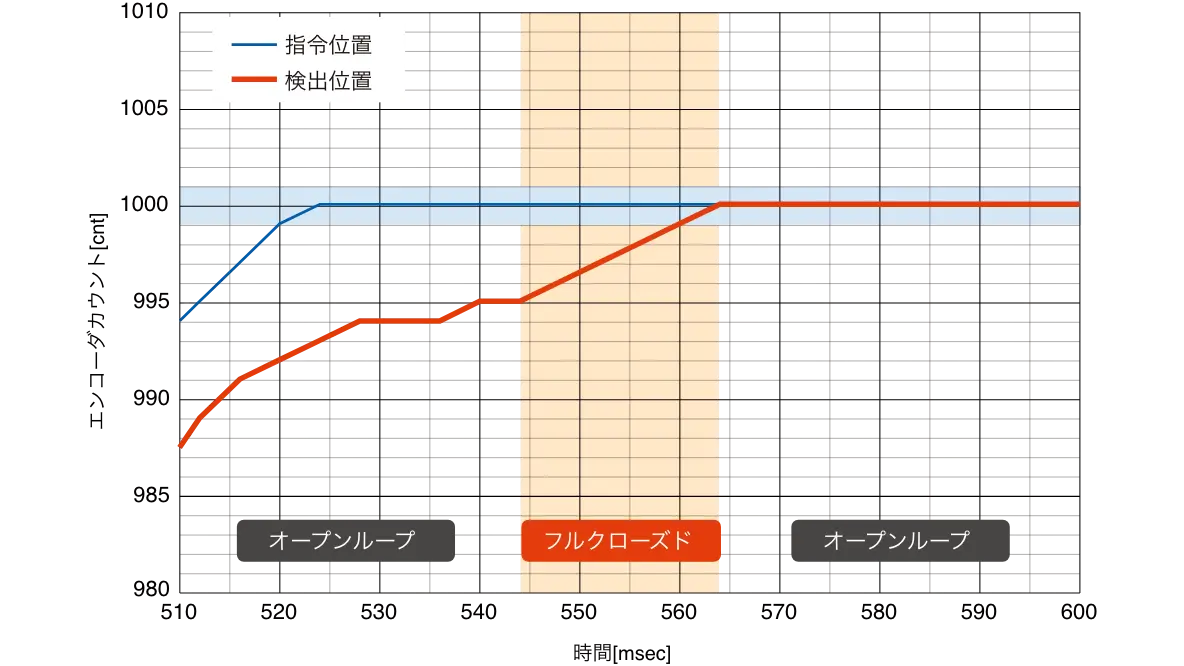 使用外部编码器的全闭环控制中,直接检测机械端的位置,并将位置反馈给驱动器。即使电动机与机械端之间的刚性影响或外部转矩,也可以进行校正,因此可以在目标位置停止。对于机构部分的温度变化引起的膨胀等影响,再现性好是其特征。(图10)